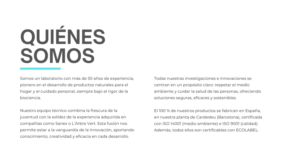 Fabricamos productos de limpieza y cuidado personal con ingredientes de origen natural, veganos, respetuosos con la salud de las personas y el planeta. Con nosotros, tus productos nacerán con la misma filosofía que guía nuestra marca: máxima eficacia, mínimo impacto.
