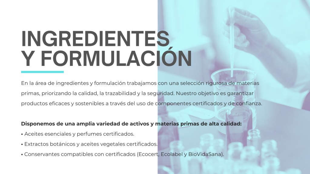Desarrollo y formulación: Creamos fórmulas desde cero o adaptamos las tuyas. Priorizamos ingredientes naturales, sostenibles y seguros.